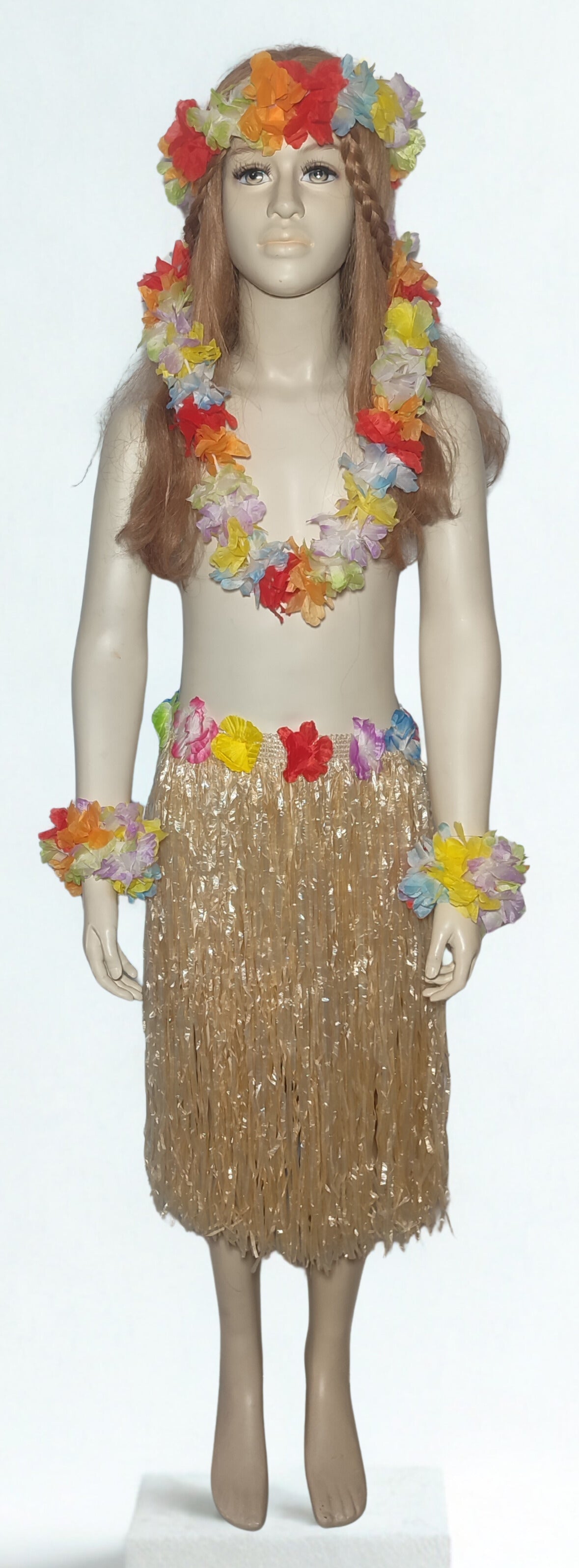 Η στολή περιλαμβάνει μια χορταρένια φούστα και αξεσουάρ με λουλούδια (στέμμα κεφαλής, κολιέ (λέι) και βραχιόλια)